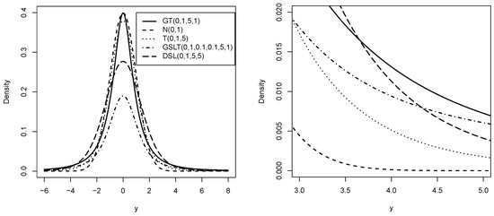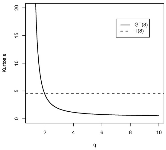 2.2. Tails Comparison of GT and Student’s t Distributions