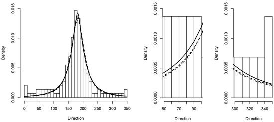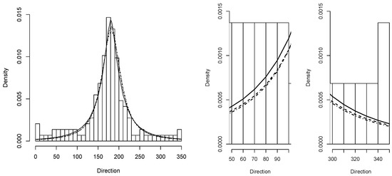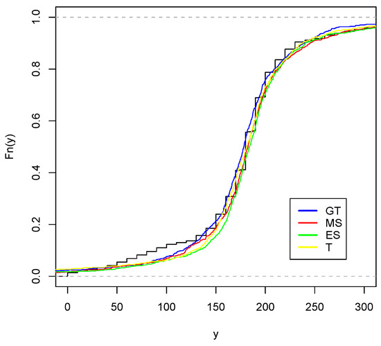 We consider the data that were first presented in Jander [16], from an entomology experiment. with respect to ants. A total of ants were individually placed in the center of an arena. The measurements correspond to the initial direction in which they moved relative to a visual stimulus in a 180 degree angle from zero direction, rounded to the nearest 10 grades. Figure 5 depicts the histogram of these data, including estimated densities under a T, , , , and model, using maximum likelihood. Figure 6 shows the qqplots for T, , and models. We use the AIC (Akaike Information Criterion), which penalizes the maximized likelihood function by the excess of model parameters (AIC = −2log(lik) + 2k, where k is the number of unknown parameters being estimated, see Akaike [17]). Table 4 shows the descriptive statistics of the database, while Table 5 presents the Kolmogorov -Smirnov (KSS) statistic, corresponding values for the four given models, which also indicates that the best fit is presented by the model. Table 6 shows a 95% confidence interval for the population mean using generalized Student’s t-quantiles. Moreover, Figure 7 depicts the empirical cumulative distribution function (cdf) and the estimated cdfs for T, , and models.