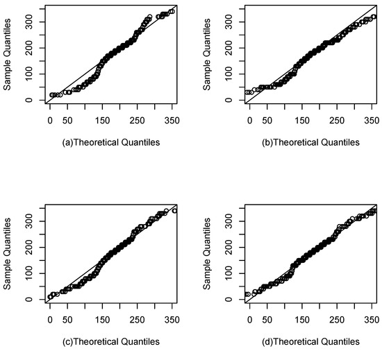 Q-q plots: student’s t (a), modified slash (b), extended slash (c), generalized student’s t (d).