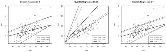 Quantile regression for BMI and LBM data with student’s t distribution (left), slash logistic distribution (center) and generalized student’s t distribution (right).