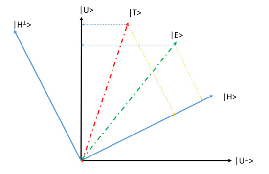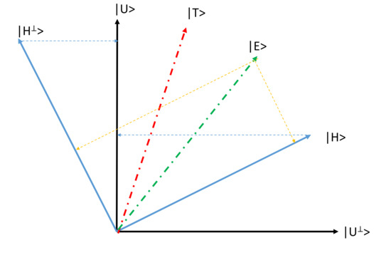 The DM has an initial representation of the projects. To each project we associate a vector that captures the initial representation i.e., the cognitive state with respect to that project (hereafter we refer simply to project-state or simply state). We use Dirac’s notation which allows easily connecting with the geometrical illustration, the initial states are denoted and with T for Tiger Forever and E for Elephants Crisis Fund. The two states are modelled as independent systems meaning that we assume that a measurement operation on one system has no impact on the other i.e., we have no entanglement. Each (represented) project is characterized by two properties (or characteristics) which are assumed incompatible with each other (in the DM mind). We call them Urgency (of the cause) and Honesty (of the NGO managing the project). The Urgency property (or perspective) is represented by a two dimensional space spanned by pure (subjective certainty) states , and corresponding to the property of the project being Urgent respectively not-Urgent. The Honesty perspective is represented by an alternative basis of the same state space (, corresponding to Honest respectively not-Honest NGO. The fact that the two bases span the same space is the geometrical expression of the (subjective) incompatibility of the two properties.