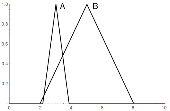 Another flaw of the -cut-based ordering is that it is not a total ordering and, for example, two fuzzy numbers depicted in Figure 1 are not comparable. The totality in the strict sense, as with the one we know from classical mathematics, is not an unavoidable property. However, cases such as the one in Figure 1 are so intuitive that anyone would expect that A is smaller than B. Incidentally, appropriate arithmetic confirms this intuition as it leads to a positive result of the difference .