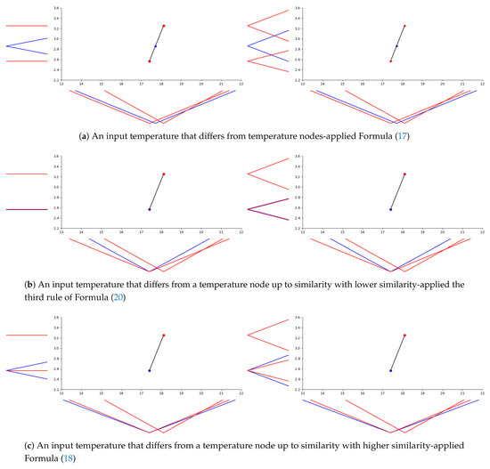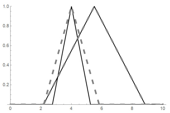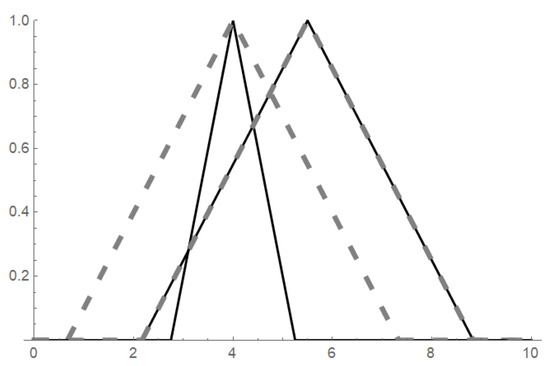 Now, let us consider the cases depicted on the right-hand side of Figure 6a. There, the antecedents are not ordered with respect to the interval-ordering of -cuts which makes impossible to use the KH method (at least in its original form) while the proposed -interpolation works well due to the robustness of the -ordering. The fuzzy relational inference here can easily infer the outputs too as the ordering of antecedents does not play any role. However, the consequent part makes the inferred outputs inappropriate, in particular, the disjointness of the consequents is an extreme version of the incoherence and thus, the implicative rules would infer a fuzzy set equal to zero on the whole universe. For the completeness, let us mention that the Mamdani–Assilian rules would result again subnormal and non-convex outputs without any functional meaning.