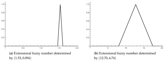 If we consider a singleton representation of a real number that is a fuzzy set such that , and for any we can construct an extensional hull of a real number. Such an object is called extensional fuzzy number or a fuzzy point, see [18,31,32].