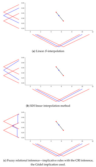 The last case we consider is the situation of a sparse rule base where fuzzy relational inference would not again meet the expectations imposed by the assumed functionality axiom. In particular, if we were given two disjoint antecedents and the fuzzy input would be placed in between of them in such a way it would be disjoint with both, the inferred output would be equal to 1 on the whole output universe (or to 0, in the case of the Mamdani–Assilian rules with the Bandler–Kohout subproduct). Here, we would like to again emphasize that this not wrong at all from the logical perspective. If the rules are logical constraints stating that the consequent should be inferred under the assumption that the antecedent holds, and none of the antecedent is met by the input, we may deduce nothing, which is mirrored by the outputs 1 or 0, depending on the semantics of the rules. This is only again a case where, without further improvement like the one proposed in [15], relational inference is not appropriate for approximate reasoning schemes of this type of sparse cases. Here, the KH method performs a practical advantage as it is deliberately designed for the sparse rule bases. This case is not demonstrated on the real data as such a case has not occurred in the ice-cream sales dataset at all. However, from the principal point of view, the results obtained from the KH method and from the proposed -interpolation would be very comparable—mimicking the cases depicted in Figure 8.