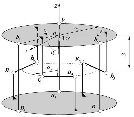 Such sensors are composed of six identical measurement branches, a load platform ( are three fixed points above the force platform, respectively) and a fixed platform ( are three fixed points above the fixed platform; the two platforms are identical and have a radius of . The distance between the geometric centers of the two platforms is ). are three vertically distributed measurement branches, where the angle between any two points of and the origin O is ; are three horizontally distributed measurement branches and are tangent to a circle of radius . These three tangent points are not only uniformly distributed on the circumference, but also the midpoint of the horizontal measurement branch. The measurement reference coordinate system of the sensor is a Cartesian coordinate system, and the origin is determined as the geometric distribution center of the force measurement platform. The z-axis is not only parallel to the vertical measuring branch but also perpendicular to the fixed platform and oriented upwards. The distance between the force measuring platform and the horizontal measuring branch is .
