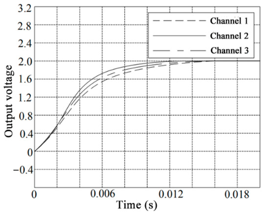 Figure 17 shows the output signal after applying the unit step signal to the three channels of the sensor simultaneously. It can be seen from Figure 17 that the output signal of the sensor oscillates before 0.01 s, and the maximum value of the oscillation is 6.4 V. After 0.02 s, the sensor output signal tends to a state of about 4 V. However, it is not completely stable, and thus, the sensor has a certain degree of inter-dimensional coupling. The output signal after dynamic decoupling of the sensor by the ICA method is shown in Figure 18. It can be seen that the output signal decoupled by the ICA method is close to the ideal unit step input after 0.014 s, and the output is at 2 V.