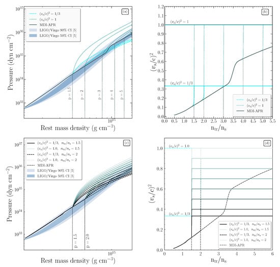 (a) Pressure as a function of rest mass density and (b) square speed of sound in units of speed of light as a function of the transition density, where p takes the values , while the speed of sound is parametrized in the two limiting cases, and . (c) Pressure as a function of rest mass density and (d) square speed of sound in units of speed of light as a function of the transition density, where p takes the values , while the speed of sound is parametrized in the range (As the speed of sound is getting higher values, the curves’ color lightens). The vertical lines display the transition cases, while the shaded regions show the credibility interval extracted from Ref. [5].