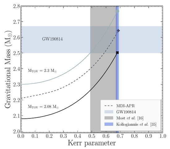 Gravitational mass as a function of Kerr parameter for the MDI-APR (MDI: momentum dependent interaction, APR: Akmal, Pandharipande and Ravenhall) equation of state (EoS). The solid lines from bottom to top represent the Equation (4) with and . The mass range of the second component of GW190814 is noted with the horizontal shaded region, while with the vertical one (left), the possible region of Kerr parameter from Ref. [16] is shown. In addition, the region for the Kerr parameter from Ref. [35], if the low mass component was rotating at its mass-shedding limit, is presented with the vertical shaded region (right). The markers point the maximum mass configuration at the mass-shedding limit.