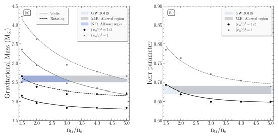 for the observable gravitational mass. For the mass of the second component, the Kerr parameter lay in the range , which is also noted in Figure 2. Secondly, using the derived relation from the recent Ref. [68], which connected the maximum value of Kerr parameter with the one of compactness parameter, as