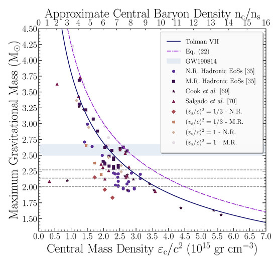 Figure 4 presents the maximum gravitational mass as a function both of the central energy density and the central baryon density. In particular, we present the results of 23 hadronic EoSs [35], for the non-rotating and maximally-rotating case, Tolman VII analytical solution, Equation (22), data from Cook et al. [69] and Salgado et al. [70], as well as the newly added data for the non-rotating and maximally-rotating case, both in and , at the transition densities under consideration. Adopting the Equation (22) for the range of the gravitational mass of the low mass component in the GW190814 event, the central energy density could be constrained in the range , meaning that NSs with higher values of central energy density could not exist. Furthermore, from Figure 4, we could also extract the corresponding region for the central baryon density, that is . Finally, all the extracted EoSs met the limit for the central energy/baryon density as they are included in the region described under Equation (22).