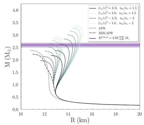 In Figure 5 one can observe two main branches, related to the transition density; the solid (dashed) curves correspond to the () case. In each branch, there are bifurcations in the families of EoSs, in analog to each speed of sound boundary condition. The higher the speed of sound, the lighter the representing color of the curves in the figure. The purple solid horizontal line, with the shaded region, indicates the estimation of the recently observed massive compact object of Ref. [1]. As Figure 5 shows, the branch of EoSs with provides stiffer EoSs compare to the branch. The EoSs of the case are more likely to provide such a massive non-rotating NS, than the case in which three EoSs of the total sum lay outside of the shaded region. Especially, between the same kind of transition density the EoSs with higher speed of sound bounds led to higher values of NS mass and radius, hence a high bound of the speed of sound (even more close to the causality as the transition density is getting higher) was needed for the description of such a massive compact object.