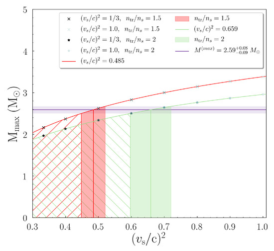 From the observation of Figure 5 a trend across the maximum masses contained in each branch of EoSs, characterized by the speed of sound bound, seemed to be inherent. Therefore, we constructed the appropriate diagram of Figure 6. The cross (star) marks represent the maximum masses of () case. As the speed of sound bound was getting higher, the marks’ color lightened. Similarly to the previous figure, the purple solid horizontal line, with the shaded region, indicates the estimation of the recently observed massive compact object of Ref. [1]. The red (green) curves represent the following fit formula for the () case, given below