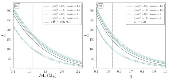 In the same way, Figure 8b shows the dependence of to the corresponding binary mass ratio q. We notice that this kind of diagram is different from the usual ones (see in comparison Figure 3 of Ref. [71]) because the chirp mass has not a unique value. To be more specific, is a variable and each point of Figure 8b corresponds to a different binary NS system with the heavier component in all cases to be a very massive NS of . One can observe a similar behavior of the curves, in analogue to Figure 8a; two main families and the EoSs with higher speed of sound provide higher values of . As the binary NS systems were more symmetric (), the binary tidal deformability got smaller. The highest values of corresponded to the most asymmetric binary NS systems. We notice that for a binary system with and the asymmetry ratio was .