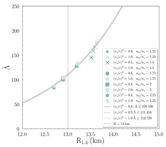 Beyond the general behavior of that we studied above, it is in our interest to examine the radius and possible constraints that can be derived from it. Following the previous steps, we focused on the case of a secondary component NS, as these values can be extracted from Figure 5. The heavier component NS is taken to be . By combining these values with Figure 7b and Equations (16) and (17), we obtained the . In Figure 9 we display this dependence; the EoSs were in five main groups, characterized by the transition density . We noticed that we expanded our study to transition densities to be more accurate in calculations and study in more detail the curves’ behavior. The higher speed of sound values correspond to lighter marks’ color. In analog to the remarks of the previous Figure 8, the high speed of sound bounds lead to higher and . Moreover, we applied a fitting expression to the cases. The expression was taken to be in the kind of the proposed relations of Refs. [72,73].
