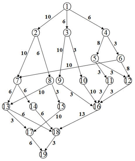Figure 5 shows an example of the weighted directed-graph for algebraic simplification. The numbers in the figure represent the mathematical expressions that are shown in Table 4. From Figure 5, we can see easily that the path ①–④–⑥–⑦–⑬–⑰–⑲, ①–④–⑥–⑦–⑬–⑱–⑲ and ①–④–⑥–⑦–⑭–⑱–⑲ are three shortest paths for the simplification of the expression ① in Table 4. Thus, the algebraic simplification complexity of the expression is 34, which is the sum of the shortest path length.