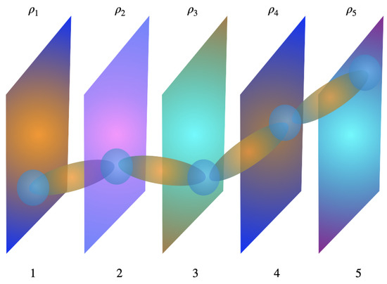 For the formal solutions given by Equation (6), it is sufficient to consider the evolutions of alone in Schrödinger equation, and we will prove in Section 5 that the “type-I” and “type-II” programs will give the same evolution of the classical information. However, in the following we give a simple and realistic example to show that in general this is not the case. For simplicity, we consider the case of a single classical world wave function. Figure 1 illustrates of the universal wave function for several particles. There is a common misunderstanding that for any . Everett’s formal solution (6) clearly satisfies this property. However, considering quantum origin of the universe, we cannot exclude the possibility that also has small background distribution. In this case, it is possible that for and all other . So in this case, we should consider to extend the domain of to the entire universe to consider the long-range gravitational effect in a more accurate way.