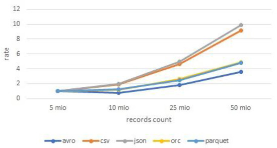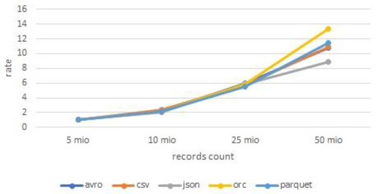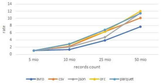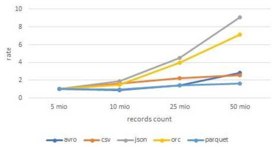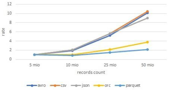 However, the results obtained cannot be considered final, since any data processing and storage system is constantly updated with this data. To study the rate of change in processing time when working with different formats, three more data sets were generated with a similar structure: 5 million records, 25 million records, and 50 million records.