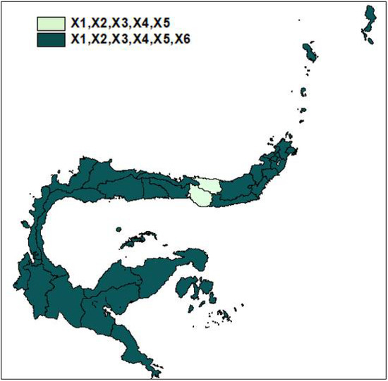 Figure 3 shows that there are two groups of regions based on common variables that significantly influence the mortality rate. The percentage of poor people, the percentage of obstetric complications treated, the percentage of pregnant mothers who received Fe3, the percentage of first-time pregnant mothers under seventeen years of age and the percentage of use of health facilities significantly affecting RIM in all regencies and cities in North Sulawesi, Gorontalo and Central Sulawesi provinces. In contrast, the percentage of households with clean and healthy lifestyle affects RIM in almost all regencies and cities in North Sulawesi, Gorontalo and Central Sulawesi provinces except North Mongondow Bolaang and Bone Bolango.