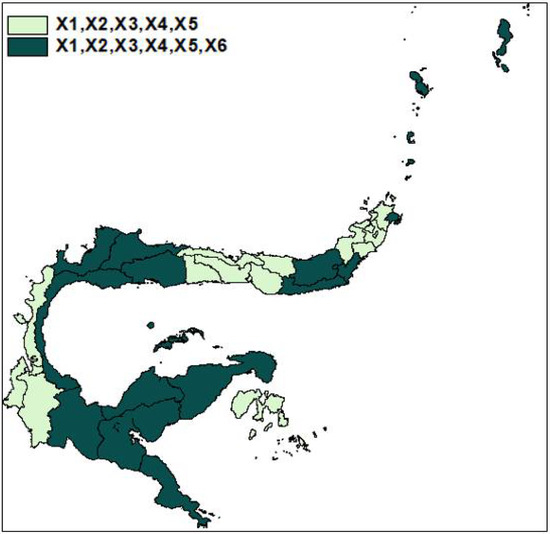 Figure 4 shows that, based on common variables that significantly affect maternal mortality, there are two groups of regencies and cities in North Sulawesi, Gorontalo and Central Sulawesi provinces. Variables that are expected to affect RMM include the percentage of poor people, the percentage of obstetric complications treated, the percentage of pregnant mothers who received Fe3, the percentage of first-time pregnant mothers under seventeen years of age, the percentage of use of health facilities, and the percentage of households with clean and healthy lifestyle. In contrast, only the percentage of households with clean and healthy lifestyle significantly affect maternal mortality in 17 regencies and cities.