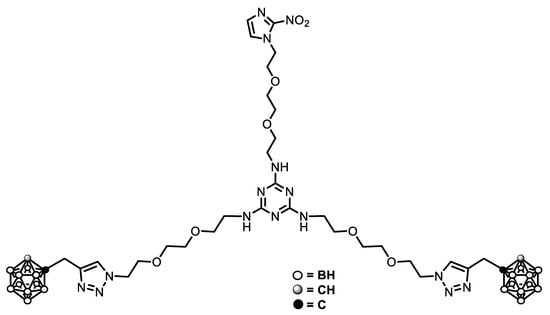 In the last 25 years, various boron-containing 2-nitroimidazole derivatives have been synthesized [,,,,]. Recently, we have reported an agent we named B381, which has shown specific accumulation in cancer tissues but, containing only one boron atom per molecule, it has furnished low boron accumulation []. To enhance boron molecular mass fractions, clusters like carboranes (C2B10H12) [] can be used for new 2-nitroimidazole-containing BNCT agents. Modular systems based on triazines are yet described and are combined with m-carboranes to boron-rich compounds [,,]. In this paper, a symmetrical hybrid compound containing two carborane residues and 2-nitroimidazole moiety on a triazine scaffold is described as a potential agent for BNCT.