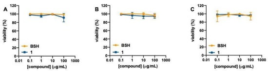 To evaluate the effect of compound 1 and BSH on cell viability human primary fibroblasts were used as representative cells, being fibroblasts present in many tissues and organs. Human primary fibroblast viability was assessed after cell treatment (24–72 h) with increasing concentrations (0.1–100 μM) of each compound, by MTT assay. No evident reduction of cell viability was measured at any concentrations and times considered (Figure 2) on human primary fibroblasts.