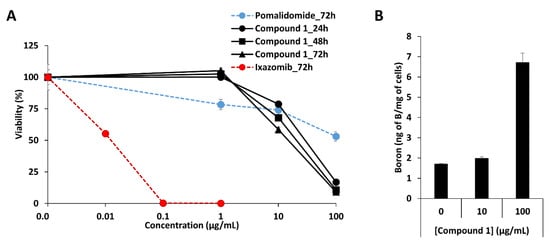 Next, we tested the effect of the compound on cell viability of a cancer cell line derived from multiple myeloma (MM) patients. MM.1S cells were treated (24–72 h) with increasing concentrations of compound 1 (0.1–100 μg/mL), as well as known MM chemotherapy including Ixazomib (0.1–1 ng/mL) and Pomalidomide (0.1–100 µg/mL) for 72 h, and cell viability was measured by MTT assay. Figure 3A demonstrates that Ixazomib in ng range is very toxic and MM.1S cells are very sensitive, Pomalidomide is less toxic and the compound 1 is moderate to MM.1S cells in µg range, implying that the compound 1 is being moderately toxic to MM.1S cells during longer exposures. Therefore, we tested the accumulation of the compound at 2 h based on boron content using ICP-OES. We demonstrate that MM.1S cancer cells accumulate boron at the highest concentration already at 2 h post-exposure (Figure 3B).