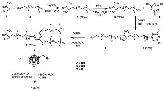 Compound 1 (Figure 1), the synthesis of which is reported in the Scheme 1, is composed of three elements: a nitroimidazole subunit, to target hypoxic tumour cells, and two o-carboranes as boron moieties, linked to the triazine through triethylene glycol-derived spacers chosen to enhance the solubility of the compound. The spacers were equipped with a primary amine on one side to allow nucleophilic substitution of the chlorine groups of the cyanuric chloride.