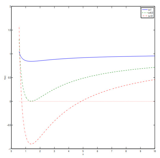 It worth noting that three parameters a, b and c are connected by the equation . We replaced the parameter a, as a function of b, c and , into Equation (14). The plot of the dimensionless function is given in Figure 2.
