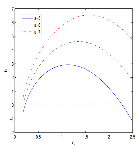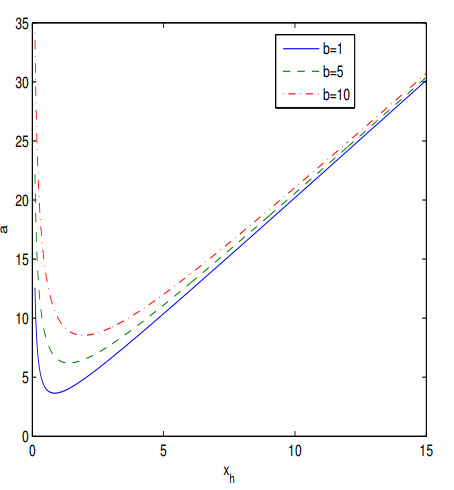 Figure 4 shows that when the parameter a increases (at fixed b), the event horizon radius (the biggest root of equation ) increases. According to Figure 5 if the parameter b increases (at fixed a), the event horizon radius decreases.