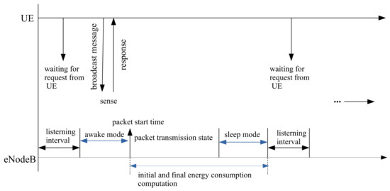 The communication between UE and eNodeB with their corresponding sleep operation has been illustrated in Figure 1, where the eNodeB remains in the idle state unless it receives a message from UE that a packet has to be transmitted. Consequently, the eNodeB transits from a listening state to an aware mode by sensing and then responding to the UE that is ready to receive an incoming packet for transmission.