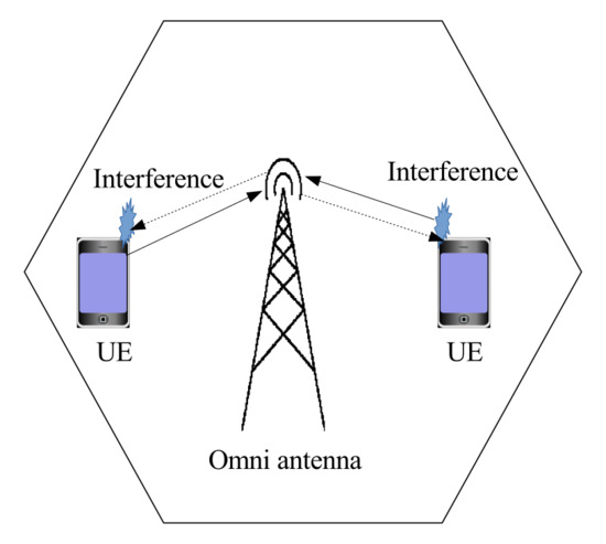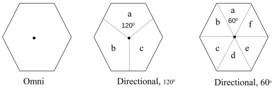 A cellular network that comprises homogeneous macro-cells with a hexagonal tessellation is presented as in Figure 4. The eNodeB is placed at the center of each cell, and UE is assumed to be served by the nearby eNodeB. Spectrum resources and power are assumed to be allocated equally to all cells in the network. Two distinct eNodeB antenna configurations are used in this section: (1) omni-directional and (2) directional antennas. An omni-directional antenna transmits radio links in all directions but has limited network capacity because of the high interference.