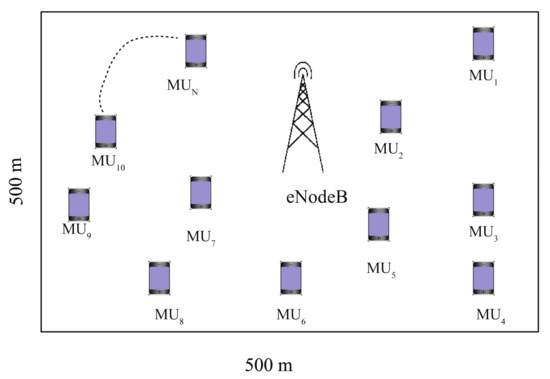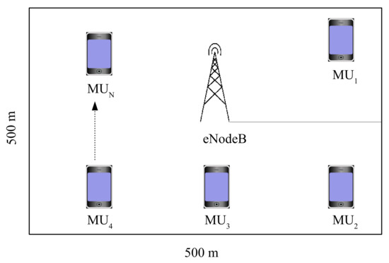 The network topology used in this work has been adopted from [16], which is used to evaluate the energy saving algorithm. As shown in Figure 7, the topology consists of one eNodeB with several Mobile Users (MUs) that are uniformly distributed in a congested network including MU1, MU2, …, MUN, where . Table 1 shows the experimental setup of the simulation parameters.