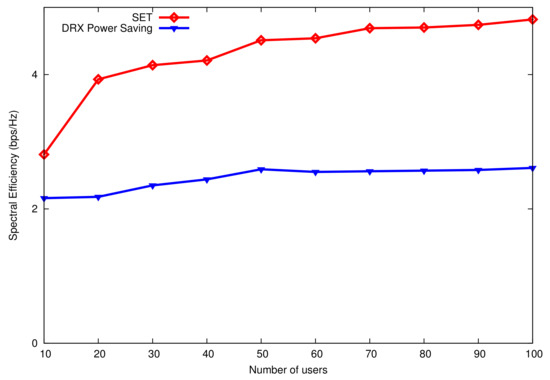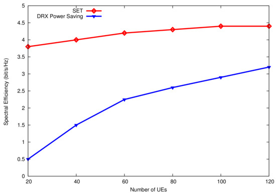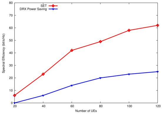 A comparison of the SE between the proposed SET algorithm and the DRX power-saving algorithm has been shown in Figure 12. As explained in Section 3, the proposed SET algorithm allocates the RBs to users with good channel states, which exhibits better performance than the DRX algorithm. It worth noting that disregarding the selection of an appropriate channel state by the DRX algorithm results in poor SE, which affects the performance of the eNodeB.