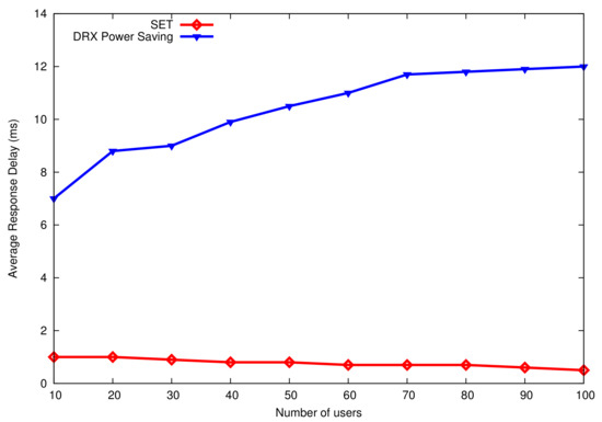 The average response delay of the proposed SET algorithm compared to the DRX power-saving algorithm has been illustrated in Figure 9. The average response delay of the DRX increases rapidly when the number of users increases because this algorithm does not consider the packet delay in resource block allocation. Furthermore, the proposed SET algorithm has lower average response delay than the DRX due to choosing the larger window before switching to the sleep-mode to accommodate incoming packets, which shows a significant improvement in the average response time in all cases.