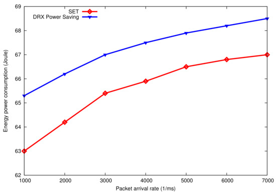 The effect on energy consumption by considering the packet arrival pattern in a non-congested network has been presented in Figure 10. Compared to the DRX power-saving algorithm, the energy consumption of the proposed SET algorithm is lower due to the appropriate adjustment of eNodeB in the initial mode. Such an adjustment is performed by predicting the downlink packet arrival that is used to update the initial state. Consequently, minimizing the number of window sleep intervals reduces energy consumption. The proposed SET algorithm can prolong battery life by 81.92% compared to only 18.08% by the DRX algorithm.