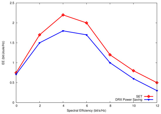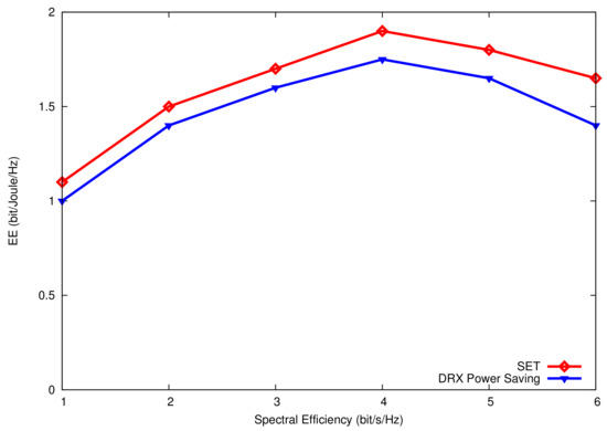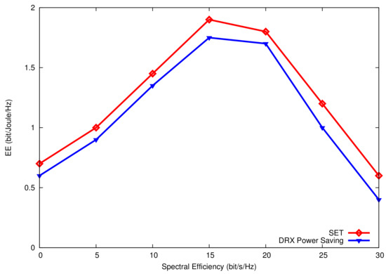 Indeed, the proposed SET is utilized to obtain the Pareto optimal points between the SET algorithm and the DRX power-saving algorithm. In this manner, the MOP in Equation (6) is transformed to the SOP in Equation (7). As shown in Figure 11, optimal EE increases until the saturation point with an increase in the SE. The proposed algorithm achieves considerable gain compared to the DRX algorithm, with optimal points of 1.9 bit/Hz and 1.75 bit/Hz, respectively.