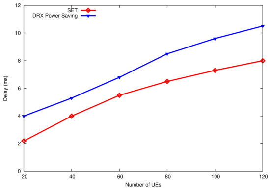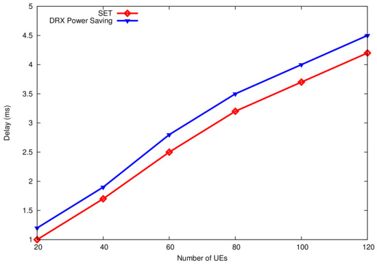 A comparison between the delay of the proposed SET algorithm to that of the DRX power-saving algorithm has been presented in Figure 13. The DRX algorithm exhibits an increased delay because the RBs allocation is established while disregarding the packet delay requirements. Moreover, the proposed algorithm is able to minimize the delay because it uses an appropriate selection of window size. Given the frequent arrival of users and the spread of radio signals in different directions by the omni-directional antenna, the competition among users to access the radio signals increases the delay in the case of the DRX algorithm that, consequently, increases the interference level.