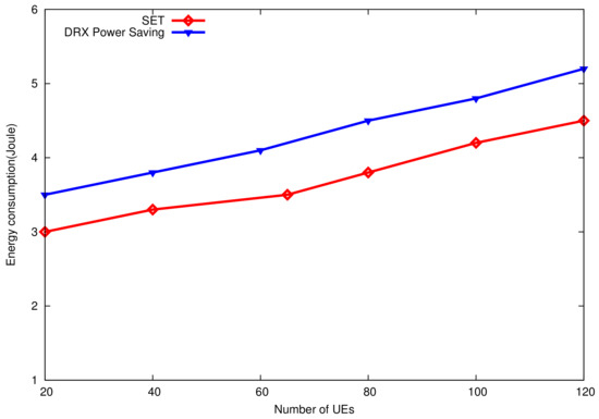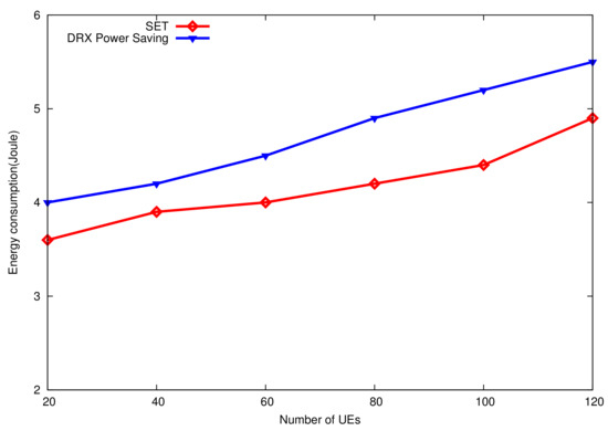 The increase in the number of UE increases the amount of consumed energy due to the high interference, as shown in Figure 18. Consequently, the total performance is degraded when the energy consumption at eNodeB increases, which leads to a significant delay increase with both algorithms. However, the proposed algorithm still able to outperform the DRX power-saving algorithm due to its appropriate method to adjust the eNodeB to a certain degree.