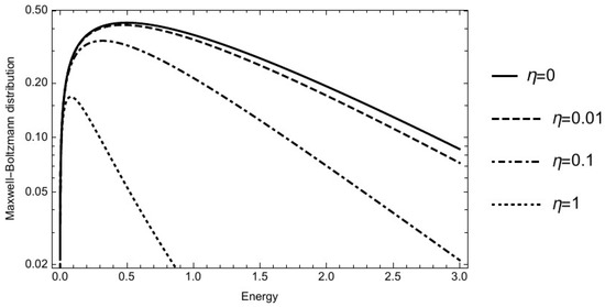 Maxwell–Boltzmann (MB) distribution versus energy for . The ordinary MB distribution is denoted by the solid curve. Here, we have set the units so that .