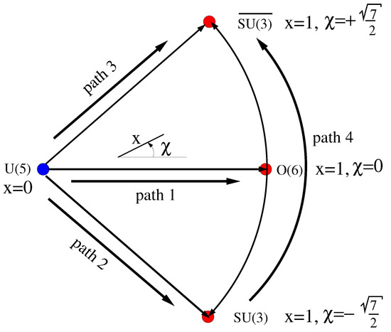 The control parameters of the model are x, and . In Figure 1, the IBM model space is schematically plotted. There are four dynamical symmetries in the model: U(5), SU(3), , and O(6). Shapes can be obtained in the model by using the intrinsic state formalism based on a coherent state (Refs. [37,38,39])