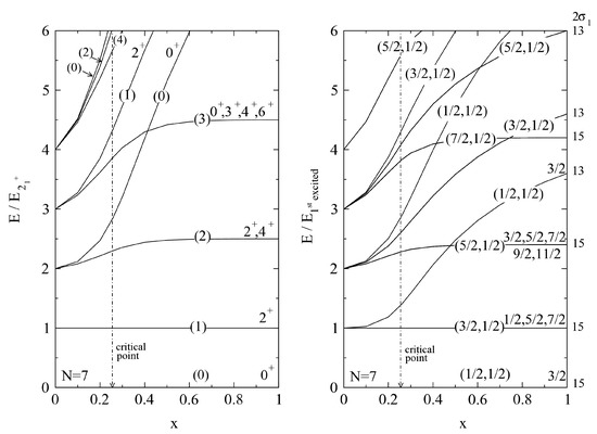 (Taken from Ref. [13]) The energy levels (normalized to the energy of the first excited state) are plotted as a function of the parameter x for the even-even system (left) and the odd-even system (right). In parenthesis, the value of in the even-even system and the values of in the odd-even system.