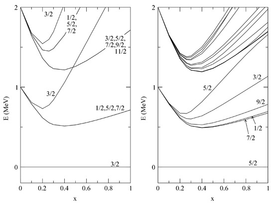 To better evidence the peculiarity of the case, we compare in Figure 3 the evolution of the spectrum in the single-j cases, and , as a function of the control parameter x. As seen in this figure, the spectrum of the case (right panel) is more complex because of the degeneracies are broken, even though it exhibits a qualitatively similar behavior with respect to that of the case, displayed in the left panel.