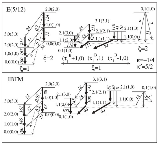 The energy spectrum of the odd-even system corresponding to the results of the IBFM calculation with the Hamiltonian (15) at the critical point, given in the lower panel of Figure 4 is compared with the corresponding energy spectrum of the odd-even system obtained within the E(5/12) model (upper panel). The critical point is roughly 0.26 for the choice of bosons. As seen in this figure, the energy spectrum obtained in both approaches are structurally analogous with each other, even though small differences remain in the energies and transition rates.