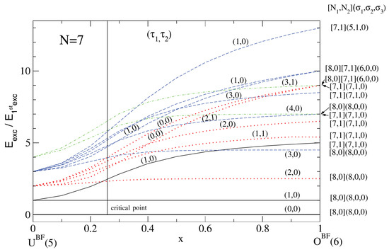 The evolution of the spectrum as a function of the control parameter x is shown in Figure 5. The boson number used is , and the critical point is as marked by a line. Energies are normalized to the energy difference between the first excited state (which is always a doublet) and the ground state. Each state is characterized by the quantum numbers, and the set , different for each band, is given for each state on the right side of the figure.