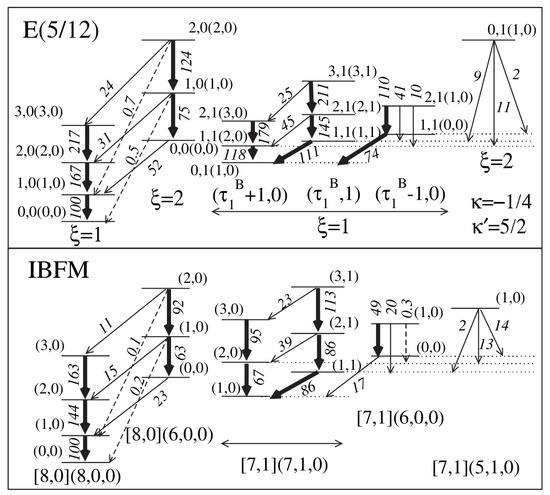 The E(5/12) critical point within the collective Bohr hamiltonian for the multi-j case [11,14] is an extension of the E(5/4) critical point [10,13]. In this subsection, we review the corresponding results for the equivalent critical point within the IBFM model, called e(5/12), for the coupling of a single fermion moving in the single-particle orbits to the bosonic core undergoing a transition from spherical to -unstable shape (path 1 in Figure 1). It is worth mentioning that the Bohr Hamiltonian in this multi-j case has two extra parameters as given explicitly in (Ref. [11], Equation (1)).