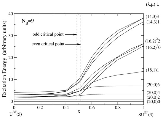With particular choice of the control parameter x in Hamiltonian (20), one can obtain the U(5) and SU(3) dynamical symmetries. The values are for U(5) and for SU(3). Changing this x parameter in the Hamiltonian, one moves between these symmetries following the transitional path from spherical (U(5)) to axially deformed (SU(3)) shapes. In this case, calculations were done for a bosonic core with bosons to which a single fermion () is coupled. The critical value of the control parameter for the even-even system is for 9 bosons since the phase transition occurs at , and the critical point of the odd-even case is [15]. The full evolution of some selected energy levels, normalized to the energy of the first excited state, along the U(5) to SU(3) transitional path is shown in Figure 7. Each state is characterized by the SU(3) quantum numbers (), which are strictly valid only at , and the O(3) quantum number, L. As seen in this figure, the general behavior of the energy levels is rather smooth close to the U(5) and SU(3) dynamical symmetries and changes rapidly in the neighborhood of the critical point, indicated by a dashed vertical line. This flat behavior close to the dynamical symmetries has been observed before, also in even systems, and called quasi-dynamical symmetry by Rowe [44].