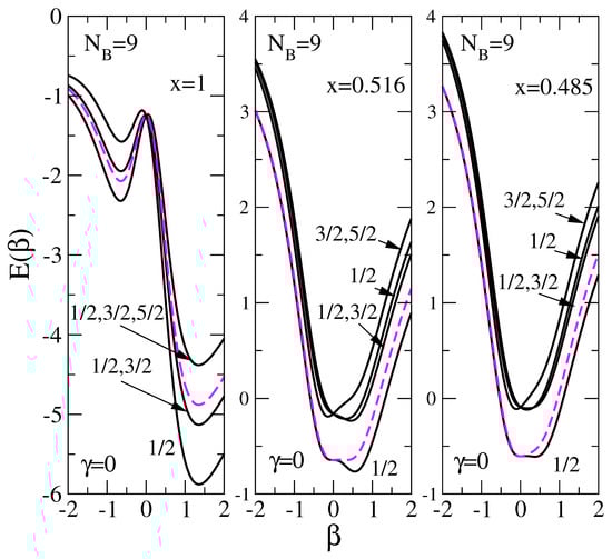 The boson-fermion energy surfaces as a function of the deformation parameter for are shown in Figure 8, in comparison with the energy surfaces for the even–even core with bosons (dashed lines). In left panel of this figure, we consider a well-deformed case, corresponding to the SU(3) dynamical symmetry, by taking the control parameter as . Here, it is clearly seen that all energy surfaces display the minimum at about the same value of the deformation parameter, namely . Therefore, the coupling with the fermion is not changing the behavior of the system in the well-deformed case.