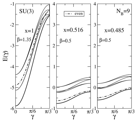 (Taken from Ref. [15]) Energy surfaces as a function of for the even-even (dot-dashed) and odd-even cases (lowest solid line) with 9 bosons. The same three values of the control parameter x as in Figure 8 are taken, and the is chosen to match the value corresponding to the minimum of the energy surface.