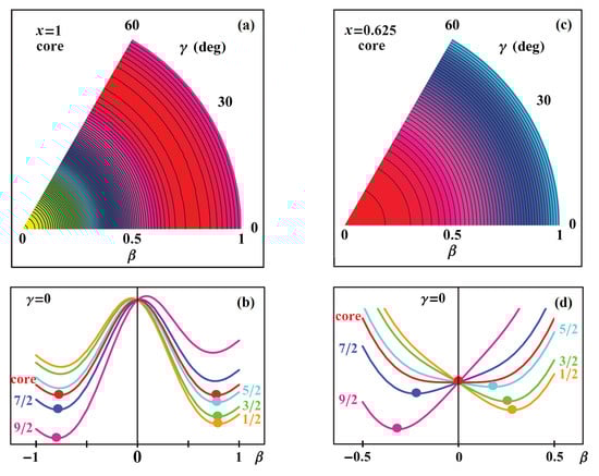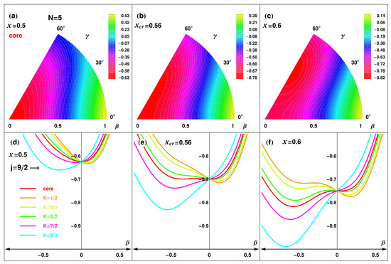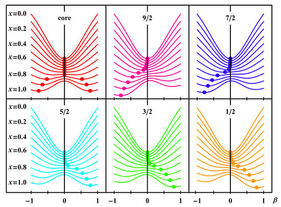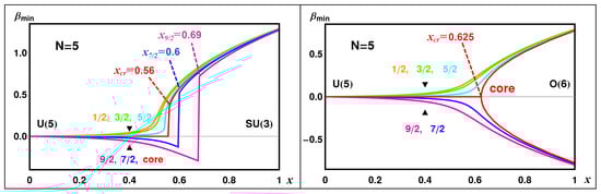 In Figure 11, the evolution of the bosonic and fermionic energy surfaces as a function of deformation for is given for a set of x values along the transitional region. When the core is inside the spherical region ( minimum in zero), the preference of states is for the prolate side shapes, and the preference of others K-states is for oblate shapes with quite small values of deformation. When the core jumps into deformed -unstable at the critical point and moves to more β-deformed -unstable shapes, the behavior of all K-states remains similar, but the modulus of their values at the energy minimum increases, showing the differences more appreciably.